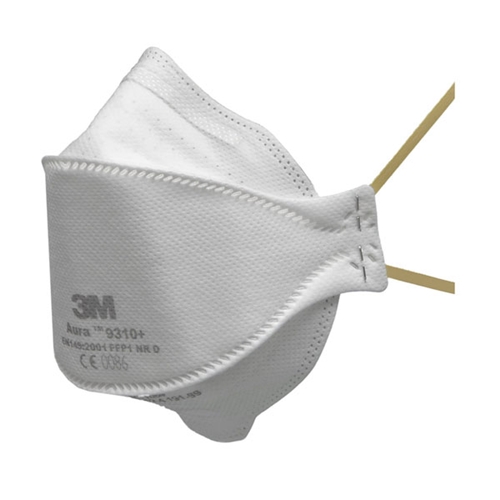 3M Aura 9310+ Flat-Fold Particulate RespiratorThe advanced three-panel design and low breathing resistance filter technology applied to the 3M Aura 9300+ Series provides optimum comfort and easy communication, thus ensuring improved wearer acceptance even during long working hours. Being foldable they offer you more convenience than traditional cup shaped respirators. Its features include an embossed and sculpted top panel for improved compatibility with reduced fogging of eyewear and an innovative chin tab to improve the ease of fitting. Provides respiratory protection against low levels of fine dusts and mists Low Breathing Resistance Filter Technology gives effective filtration with low breathing resistance for consistent high quality performance. Fold-Flat, easy to store, proprietary 3-panel design accommodates facial movement for wearer comfort. Individual hygienic packaging helps protect the respirator from contamination before use. Smooth inner cover-web and large soft nose foam for greater comfort against the skin. Even-tensioned straps relieve pressure for a comfortable and secure fit. Yellow colour coded straps denoting FFP1 protection level. Standard: EN149:2001 FFP1 NR D Approval: CE Marked Assigned Protection Factor: 4