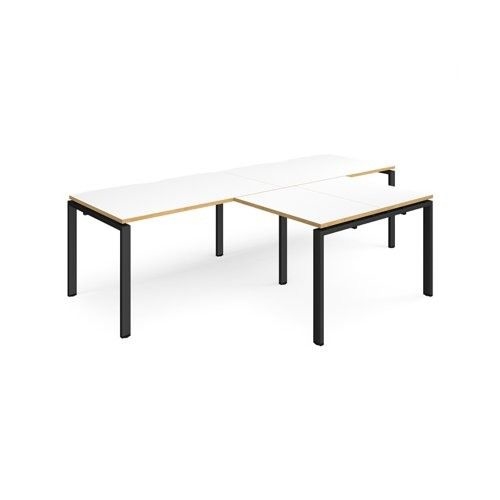 Adapt double straight desks 2800mm x 800mm with 800mm return desks - black frame, white top with oak edge