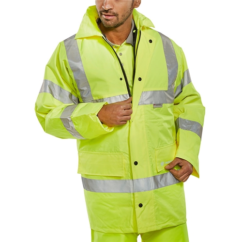 Heavyweight PU coated polyester. Nylon lining. Concealed hood. Two-way heavy weight zip with storm flap. 2 Lower hip pockets with flaps. Knitted storm cuffs. Fully taped seams. Conforms to EN ISO 13688:2013+A1:2021 Conforms to EN ISO 20471:2013+A1:2016 Class 3 High Visibility Conforms to EN343:2019 Class 3 Water Penetration Class 1 Air Permeability Class X Readymade water tower test