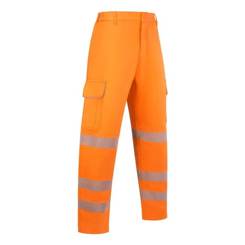 Fire Retardant, Hi Vis, Anti-static, ARC Flash orange cargo style trousers RIS-3279-TOM issue 2 for use on or around railway lines 280gsm 50% Polyester, 26% Modacrylic, 17% Cotton, 7% Aramid with antistatic. 5 belt loop part elastic waistband, double button closure. 2 hip pockets. Rear patch pocket with hook and loop closure flap. Large bellows pocket to each leg with hook and loop closure flap. Right leg mobile phone pocket with hook and loop closure flap. All pocket flaps with Retro-reflective tape feature. Internal knee pad pouches. Large qualifying icons on left leg pocket. Available in Short, Regular, and Tall leg Certified to 50 washes Conforms to: EN ISO 13688:2013+A1:2021 EN ISO 20471:2013+A1:2016 (Class 2) RIS-3279-TOM Issue 2:2019 EN 1149-5:2018 EN ISO 11611:2015 (A1 Class 2) EN ISO 11612:2015 (A1 B1 C1 E1 F1) EN 61482-2:2020 - (ATPV = 8.1 Cal/cm2) (ELIM = 6.9 Cal/cm2) (APC = 1)