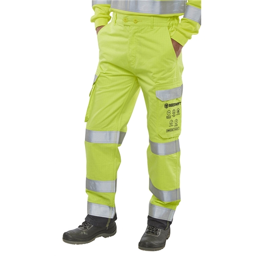 Fire Retardant, Hi Vis, Anti-static, ARC Flash cargo style trousers. 300gsm 60/40 Modacrylic/cotton blend. Triple stitch construction. 7 belt loop part elastic waistband, double button closure. 2 hip pockets. Rear patch pocket with hook and loop closure flap. Large bellows pocket to each leg with hook and loop closure flap. Right leg mobile phone pocket with hook and loop closure flap. All pocket flaps with Retro-reflective tape feature. Internal knee pad pouches. Large qualifying icons on left leg pocket. Navy contrast fabric below lower hi-vis retro reflective band Conforms to: EN ISO 13688:2013 EN ISO 20471:2013+A1:2016 (Class 2) EN 1149-5:2018 EN ISO 11611:2015 (A1 A2 Class 1) EN ISO 11612:2015 (A1 A2 B1 C1 F1) EN 61482-2:2020 - (ATPV = 17.0 Cal/cm2) (ELIM = 14.0 Cal/cm2) (APC = 1)
