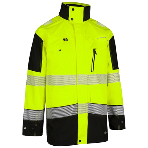 75% Ripstop Polyester with a 25% PU Laminate210gsm fabric weightMedium weight jacket.Bird eye mesh liner enables the Level 4 breathability with an Ret of 9.55Water penetration tested to hydrostatic pressure of 177,000 PaFully taped seams60mm segmented tape for greater visibilitySegmented tape to shoulders for additional visibilityHi viz accents for added stylingDetachable concealed 3 panel fully adjustable hoodFull length heavy duty YKK zip with stud sealed storm flapInternal wicking strip to reduce water ingressDouble Studded snorkel with fleece lined neckSoft touch zip pulls on all zipsConcealed right breast pocketLeft breast pocket with laminated water resistance zipConcealed zip pocket to storm flapTwo lower pockets with stud sealed flapsTwo inside pocketsOne internal phone pocketInternal knitted cuffsExternal stud adjusters to storm cuffsD ring hook for security or ID passContrast colour in areas that soil mostGenerous sizing to interact with other garments Jacket can be used in combination with the Interactive bodywarmer (BSDBWTT) Conforms to EN ISO 13688:2013+A1:2021 Conforms to EN ISO 20471:2013+A1:2016 Class 3 High Visibility Conforms to EN343:2019 Class 4 Water Penetration Class 4 Air Permeability Class X Readymade water tower test