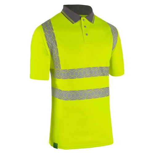 100% Recycled polyester "Bird Eye" fabric. 160gsm fabric weight 3 Button placket. Grey trim to collar and cuffs. Hex patterned heatseal Retro-Reflective tape for comfort and flexability. UV Protective SPF40, "EN 13758-1 - Part 1: Method of test for apparel fabrics." Global Recycled Standard Certificated Tested to 50 washes Conforms to EN ISO 13688:2013+A1:2021 Conforms to EN ISO 20471:2013+A1:2016 Class 2 High Visibility