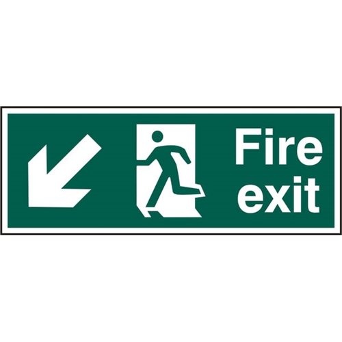 Fire exit (Man arrow down left) safety sign Rigid PVC Sticks to most surfaces Can be wiped clean 400 x 150mm