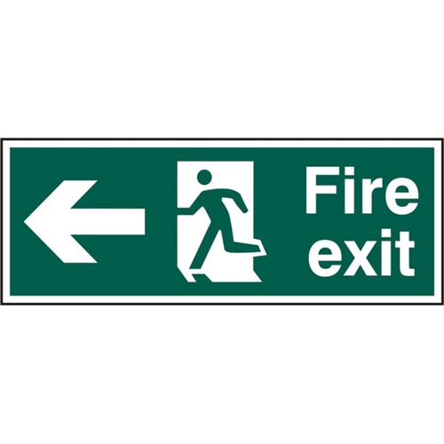 Fire exit (Man arrow left) safety sign Rigid PVC Sticks to most surfaces Can be wiped clean 400 x 150mm