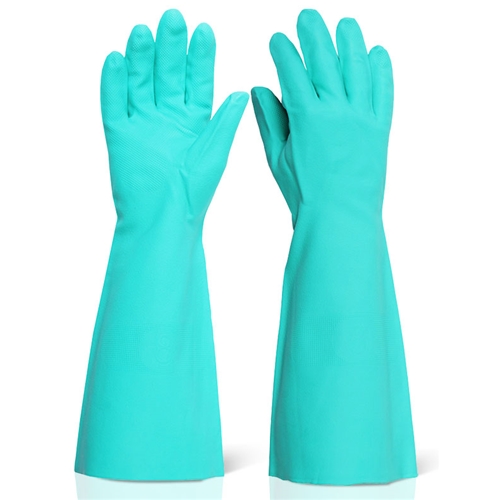 Unsupported nitrile glove. Overall Length 45cm A high level of resistance to abrasion, solvents and animal fats. Pebble finish to palm Silicon and wax free EN ISO 374-1: 2016: Type B Chemical - Breakthrough Time Methanol (A) - More than 60 Mins (Level 3) Toluene (F) - More than 10 Mins (Level 1) n-Heptane (J) - More than 480 Mins (Level 6) Sulphuric Acid 96% (L) - More than 240 Mins (Level 5) Sodium Hydroxide 40% (K) - More than 480 Mins (Level 6) EN388: 2016 Level 4 - Abrasion Level X - Cut Resistance Level 0 - Tear Resistance Level 2 - Puncture Level X - ISO 13997 Blade Cut EN ISO 374-5:2016 Protection Against Bacteria and Fungi - Pass Protection Against Viruses - Not Tested