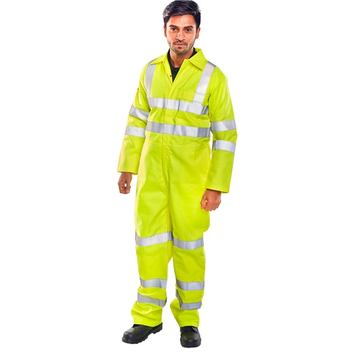Multi purpose 'utilties' boilersuit Fire Retardant Anti Static 320gsm Hi Vis flame retardant treated fabric with anti static grid 80% Cotton 19% Polyester 1% anti static 2 Vertical side access hip pockets High visibility 1 left breast pocket with sewn down flap Concealed stud fly front to neck Plain back Internal knee pouch pockets Elastic to waist Plain cuffs and ankles Retro-reflective tape FR/AS embroidery to left sleeveEN ISO 11612: 2008 Class A1. B1. C1. - Protection against heat and flameEN1149-5: 2008 - Anti Static - Material performance and design requirementsEN ISO 20471: 2013 Class 3. - Test requirements for high visibility