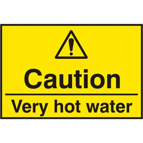 Caution Very hot water safety sign Self adhesive vinyl backing Sticks to most surfaces Can be wiped clean 75 x 50mm