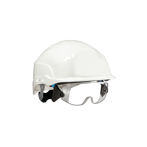 Specialised ABS safety helmet with integrated retractable over spectacles The over spectacle design allows for prescription eyewear to be used underneath it Overspectacles provide Grade B medium energy impact protection to EN 166, better than standalone spectacles Anti-scratch and anti-mist coating provides improved durability and visibility Largest front logo area of any industrial safety helmet Helmet approved to EN 397, EN 50365 Visor approved to EN 166