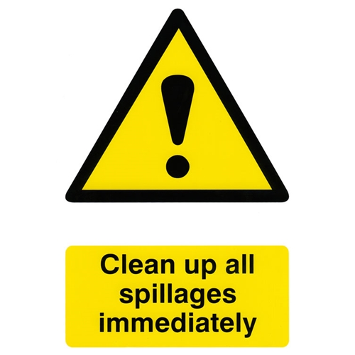 Clean up all spillages immediately Safety Sign Self adhesive backing Sticks to most surfaces Can be wiped clean Semi-Rigid PVC 200 x 300mm