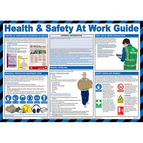 User friendly text and clear instructions show employees how to prevent accidents and injury whilst maintaining a healthy working environment Durable laminated construction with full colour illustrations Compiled by qualified health and safety practitioners Size 59 x 42cm (A2 Paper size)