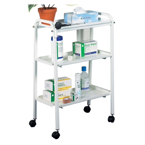 White, epoxy coated, tubular metal frame Three shelves manufactured from melamine face, high-density board Ideal for first aid rooms 30cm x 51cm x 72.5cm