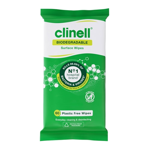 Clinell Biodegradable Surface Wipes are plastic-free wipes designed for cleaning & disinfecting surfaces and high-touch points, whether at home, in your workplace or on the go. Antibacterial wipes which kill 99.99% of bacteria and viruses, including E. coli, salmonella, MRSA, norovirus, adenovirus, coronaviruses and flu in 30 seconds, offering a fast acting solution that is both tough on germs and gentle on the environment. Dermatologically tested to be kind to skin and safe to use on hard, non-porous surfaces. Biodegradable within active landfill conditions and complete with recycle-ready packaging.