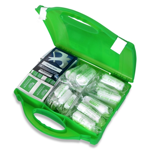 Kit Contains:- 1 x Guidance note 8 x Non woven triangular bandages 4 x Large sterile dressing (180 x 180mm) 12 x Medium sterile dressing (120 x 120mm) 6 x Sterile eye pad dressing 60 x Assorted sterile waterproof plasters 20 x Alcohol free cleansing wipes 3 x Pair of disposable vinyl gloves 12 x Safety pins