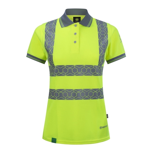 100% Recycled polyester "Bird Eye" fabric. 160gsm fabric weight 3 Button placket. Grey trim to collar and cuffs. Hex patterned heatseal Retro-Reflective tape for comfort and flexability. UV Protective SPF40, "EN 13758-1 - Part 1: Method of test for apparel fabrics." Global Recycled Standard Certificated Tested to 50 washes Conforms to EN ISO 13688:2013+A1:2021 Conforms to EN ISO 20471:2013 +A1:2018 Class 2 high visibility (sizes S+ (08+)) Class 1 high visibility (size XS (06))