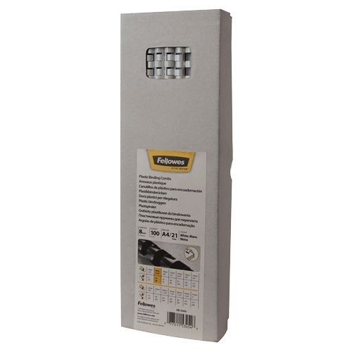 Fellowes (8mm) A4 Plastic Comb (White) - 1 x Pack of 100 Plastic Combs Ref 5345406