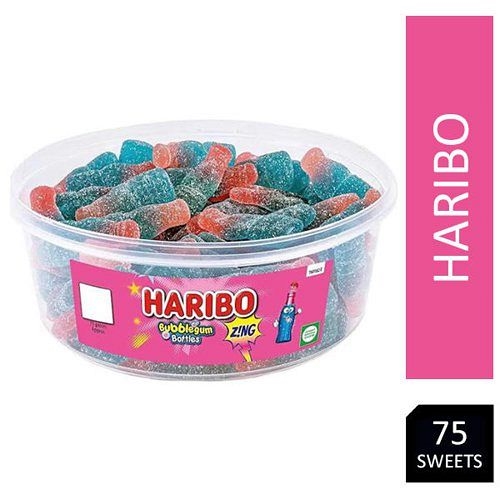 Delicious Haribo Fizzy Bubblegum Bottles, fruity flavoured sweets x 75 in a tub. You can be sure to tempt them with these tasty sweets. Great for sharing, parties, celebrations and more!