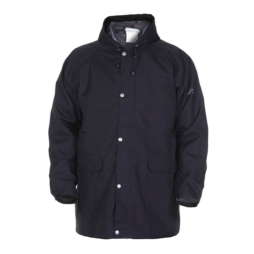 Zip front with storm flap cover and press stud closure Fixed hood Elasticated cuffs with press stud closure 2 front pockets with flap Mesh polyester lining Simply no Sweat (SNS) 210gsm Polyester laminate fabric Highly breathable providing great comfort Durable and cost effective Smooth polyester textile finish Conforms to EN343 Class 3 Water penetration Conforms to EN343 Class 3 Breathability