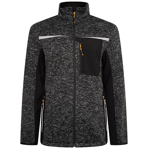 Knitted fabric: 100% polyester 370gsm Softshell fabric: 100% stretch polyester 280gsm Full zip style Two side entry zipped pockets Zipped left chest pocket Elasticated taped cuffs Elasticated drawcord around bottom hem Reflective tape on chest and shoulders Reflective JCB branding