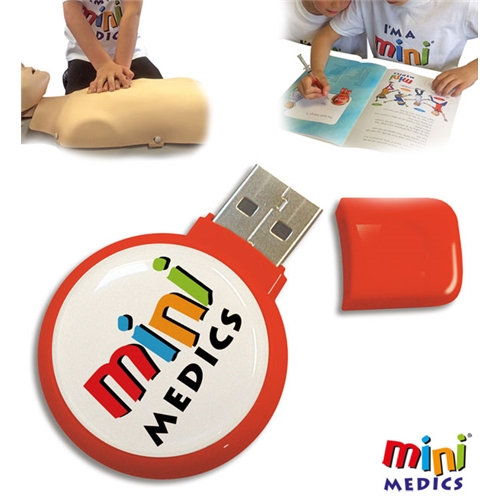 USB pen drive with Microsoft Powerpoint presentations and resources for the Mini Medics first aid training course for kids.CLICK MEDICAL in conjunction with Nuco Training are promoting a new initiative, 'Mini Medics'This is a very basic introduction to First Aid and Defibrillation aimed at children between the ages of 8 and 11, but it can suit children of any age.The course does not use confusing terminologies and shows complete respect for the child's ability, making it educational and practical, and instilling the importance of helping someone who is poorly or injured.Providing one of your staff has completed a first aid course, they can use all the course details onThe 'Mini Medics' USB, which includes a fully illustrated Powerpoint presentation, information sheets, flyers and display banner.This is used in conjunction with our 24 page fully illustrated A4 colour book (sold separately) which includes a cut out Mini medics certificate for each child who takes the course. Each book comes complete with a unique Mini Medics syringe pen (Code: CM1322) or pencil pack (Code: CM1323) . The entire presentation course and resources to carry out the Mini Medics program.
