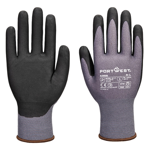 The A356 delivers superior ESD protection, durability, and precision. Made with Nylon, Elastane, Carbon Fibre, and a 15-gauge ultra-thin Nitrile Micro Foam coating, these breathable gloves offer excellent grip, tactile sensitivity, and comfort. Reinforced for durability, they are ideal for electronics and sensitive environments.. Size/Fit XXL/R, Grey/Black