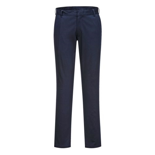 This Women's slim fit stretch chino is the perfect uniform solution. It offers a contemporary slim fit in a dynamic cotton stretch twill fabric. The stretch fabric gives the ultimate in comfort and freedom of movement. Features include side pockets, a rear buttoned jetted pocket and a hook and bar waist fastening. Highly durable with twin stitching throughout and bar-tacked at all stress points. . Size/Fit 24/R, Dark Navy