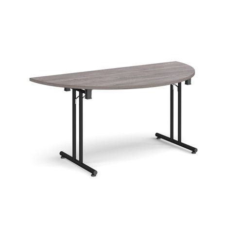 Semi circular folding leg table with black legs and straight foot rails 1600mm x 800mm - grey oak