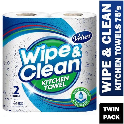 Velvet Wipe and Clean household towels are strong absorbant kitchen rolls with perforated sheets for easy tearing.